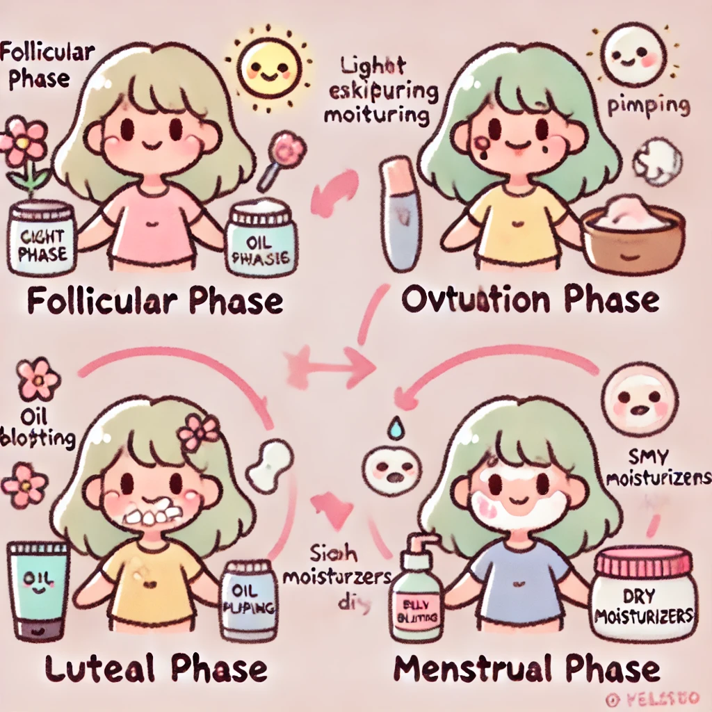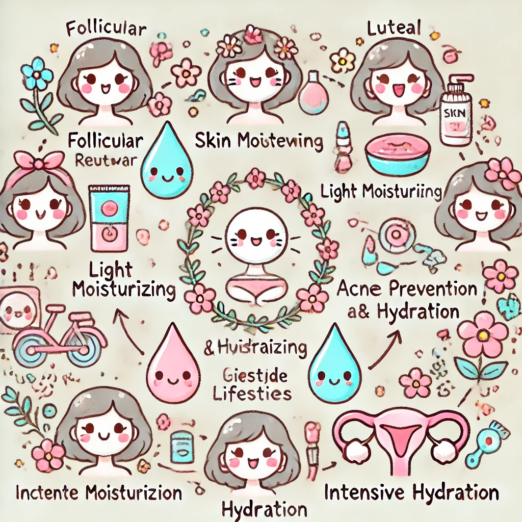 卵胞期には肌の再生を促進するケア、排卵期には軽めの保湿ケア、黄体期にはにきび予防と保湿ケア、月経期には集中的な保湿ケアが効果的です。これらの周期に合わせて適切なスキンケア製品を選択し、使用することが重要です。