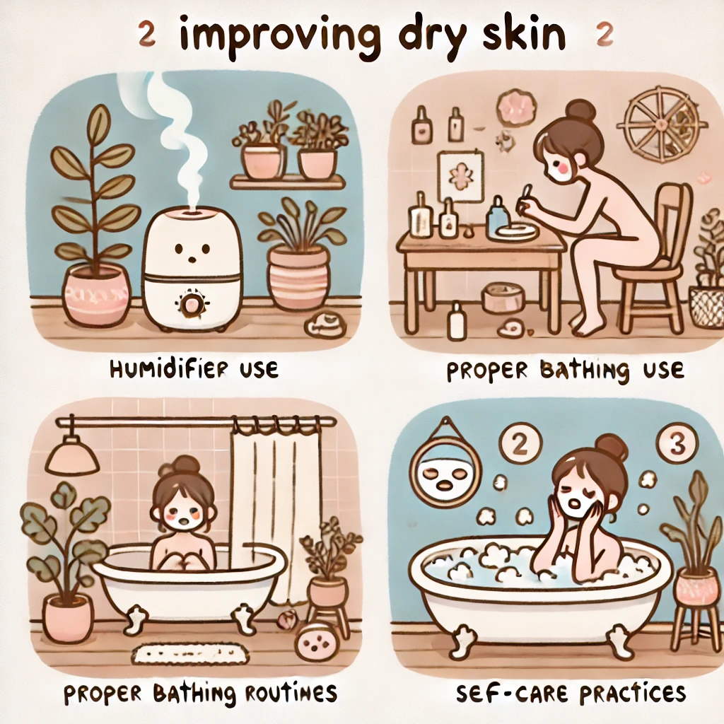生活改善法としては、湿度管理の重要性、適切な入浴方法、日々のセルフケア習慣などを詳しく解説しました。これらの習慣が乾燥肌の改善にどのように寄与するかを明確に示しています。