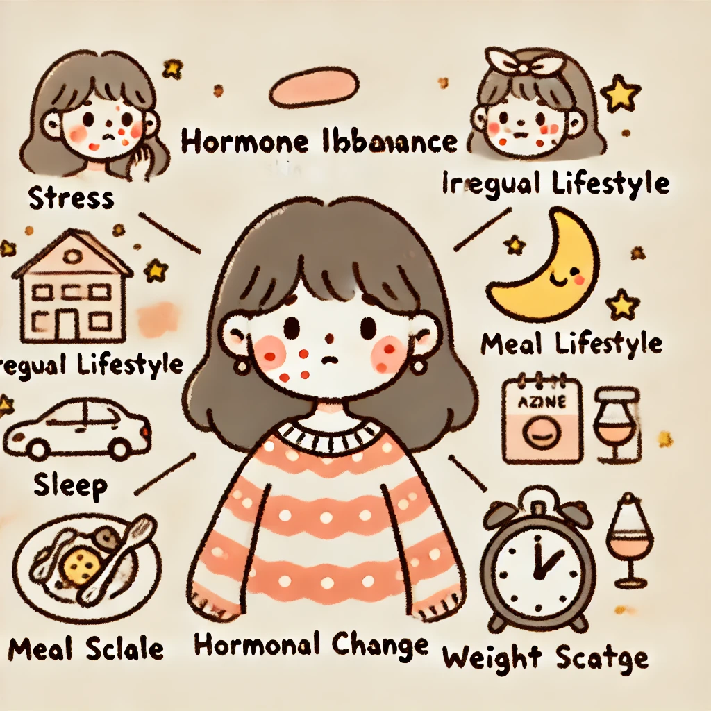 ホルモンバランスの乱れは、大人ニキビだけでなく、さまざまな肌トラブルや体調不良の原因となります。自分の体と向き合い、適切なケアを行うことが、美しく健康的な肌を保つ秘訣です。次章では、ホルモンバランスの乱れが引き起こす大人ニキビについて、さらに詳しく見ていきます。