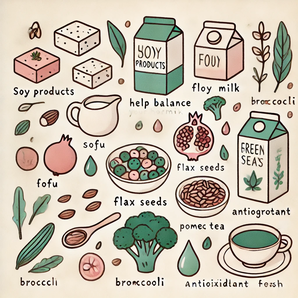 大豆製品(豆腐、納豆など)、亜麻仁、緑黄色野菜、青魚などが効果的です。これらの食品には植物性エストロゲンやオメガ3脂肪酸が豊富に含まれており、ホルモンバランスの改善に役立ちます。