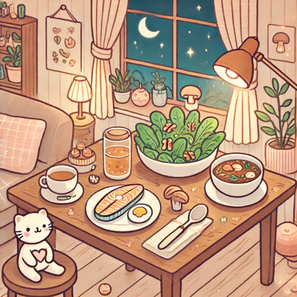 オメガ3脂肪酸が豊富な魚類(サーモン、マグロ、サバなど)、ビタミンDを含むキノコ類、マグネシウムが豊富な緑黄色野菜を積極的に摂取しましょう。また、高糖質・高脂肪食品を避け、就寝前にはカフェインやアルコールの摂取を控えることが大切です。ハーブティー(カモミールやラベンダー)を飲むのもおすすめです。
