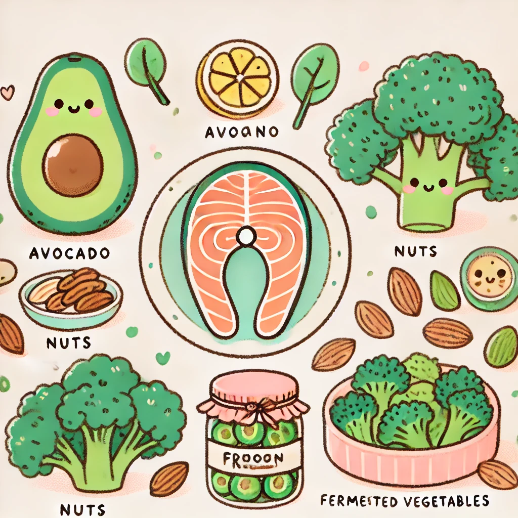 例えば、ビタミンEやオメガ3脂肪酸を豊富に含むアボカドやサーモンは、肌の弾力を保ち、抗炎症作用で肌トラブルを防ぐ効果があります。また、発酵食品を積極的に摂取することで腸内環境を整え、ホルモンの代謝や免疫機能を向上させることができます。