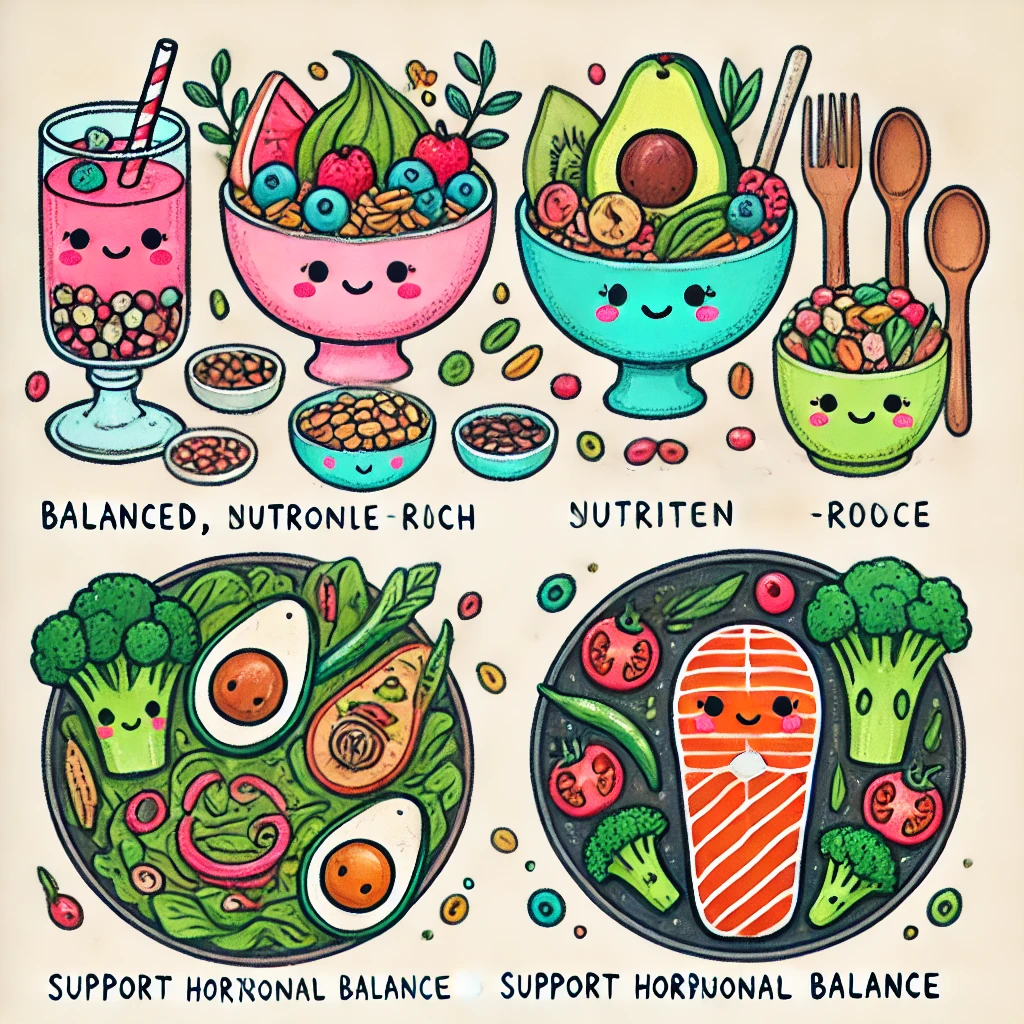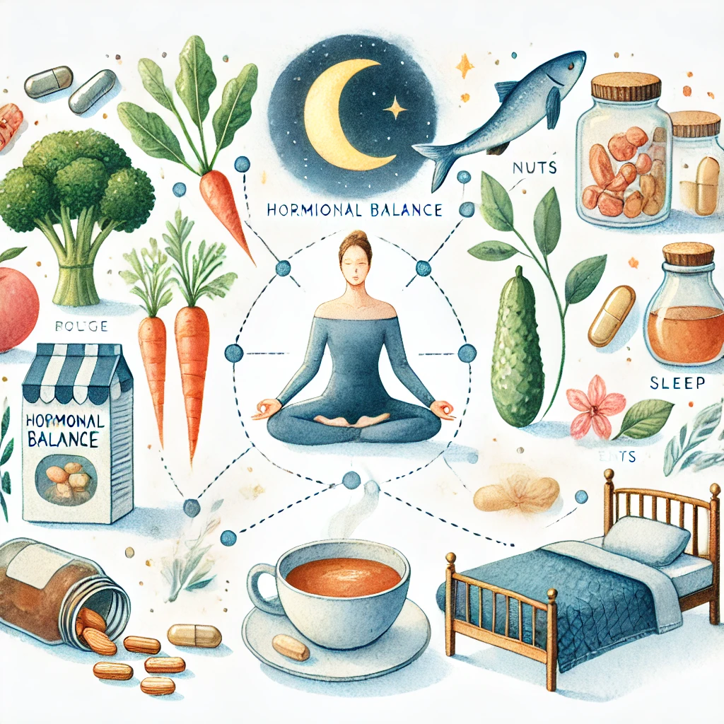 まず、食事面では、大豆製品、緑黄色野菜、魚介類、ナッツ類などのホルモンバランスをサポートする食材を積極的に摂取することが大切です。これらの食材に含まれるイソフラボン、ビタミンA、βカロテン、EPA、DHA、ビタミンEなどの栄養素が、ホルモンバランスの維持に役立ちます。一方で、加工食品、白砂糖、過度のアルコールやカフェインは避けるべきです。