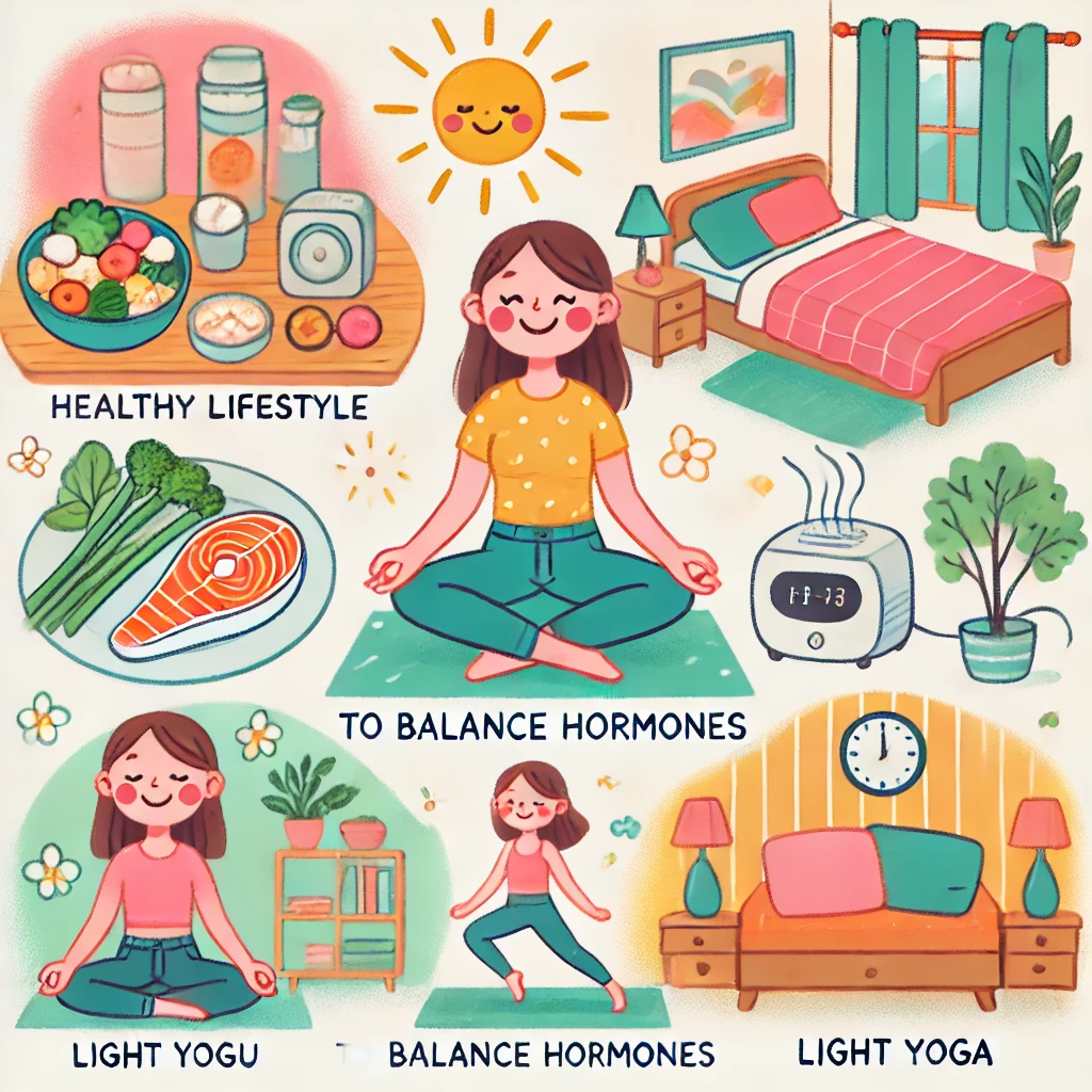 ホルモンバランスを整えるためには、バランスの取れた食事、適度な運動、十分な睡眠が重要です。食事では、大豆イソフラボン、オメガ3脂肪酸、ビタミンC、Eなどを積極的に摂取しましょう。運動は、ウォーキングやヨガなど、週3回程度の軽い運動を心がけます。睡眠は、毎日同じ時間に就寝・起床し、質の良い睡眠を7-8時間取ることが理想的です。また、ストレス管理も重要で、瞑想やリラックス法を取り入れると良いでしょう。