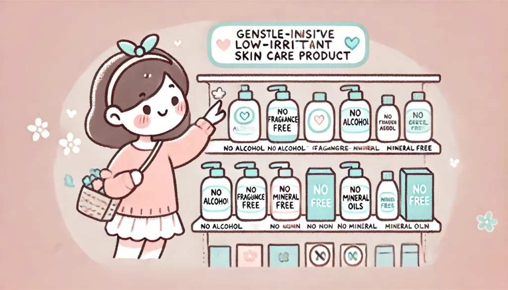 アルコール、合成香料、着色料、鉱物油は避けるべき成分です。代わりに、セラミド、ヒアルロン酸、アロエベラ液汁、カモミールエキスなどの低刺激で保湿効果の高い成分を含む製品を選びましょう。また、新製品を使用する際は必ずパッチテストを行うことをおすすめします。