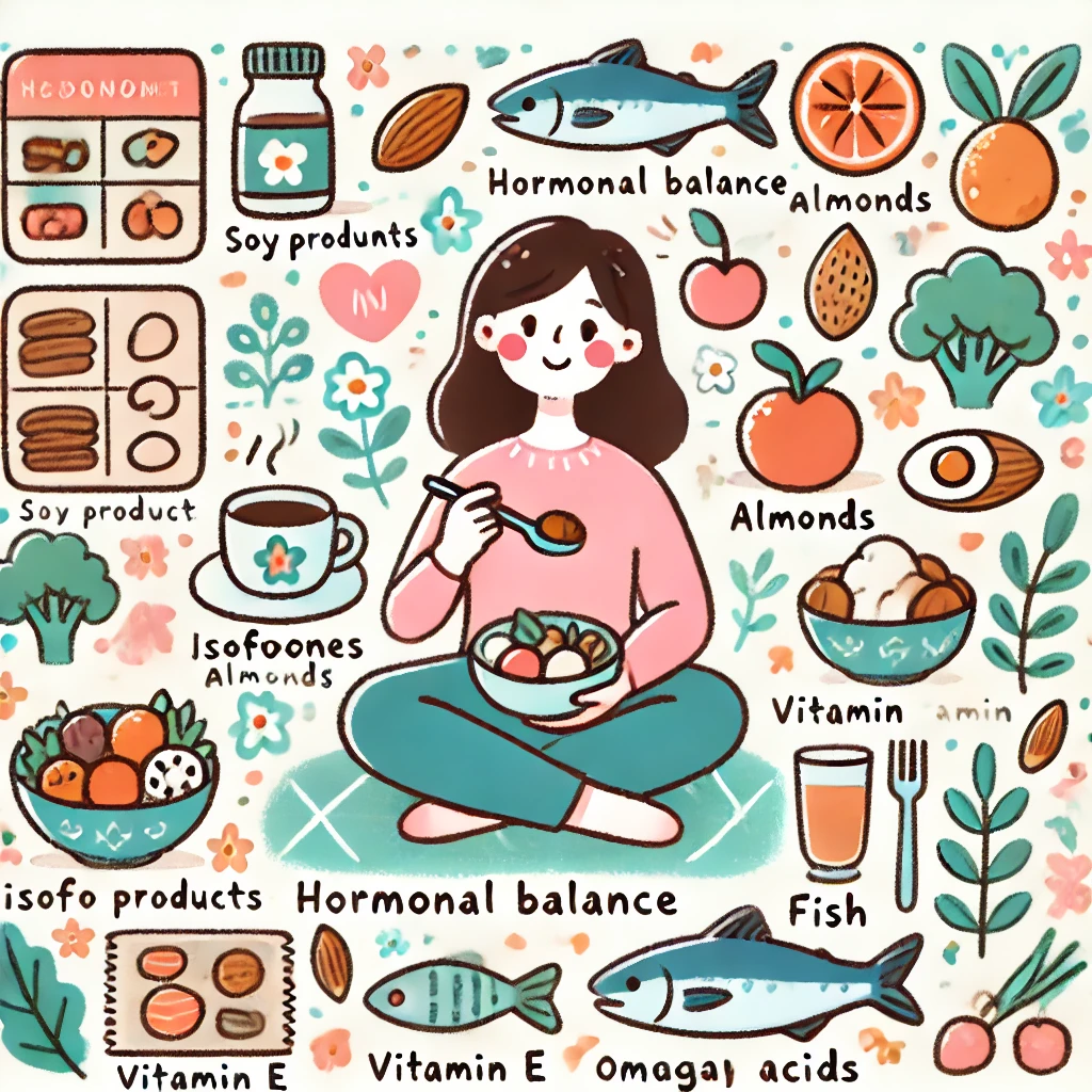 植物性エストロゲンを含む大豆製品、良質なタンパク質、オメガ3脂肪酸を含む食材を積極的に摂取しましょう。また、食事の時間を規則正しく保ち、夜遅い食事は避けることが重要です。砂糖や精製された炭水化物は控えめにし、抗酸化物質が豊富な野菜や果物を十分に摂取することをおすすめします。