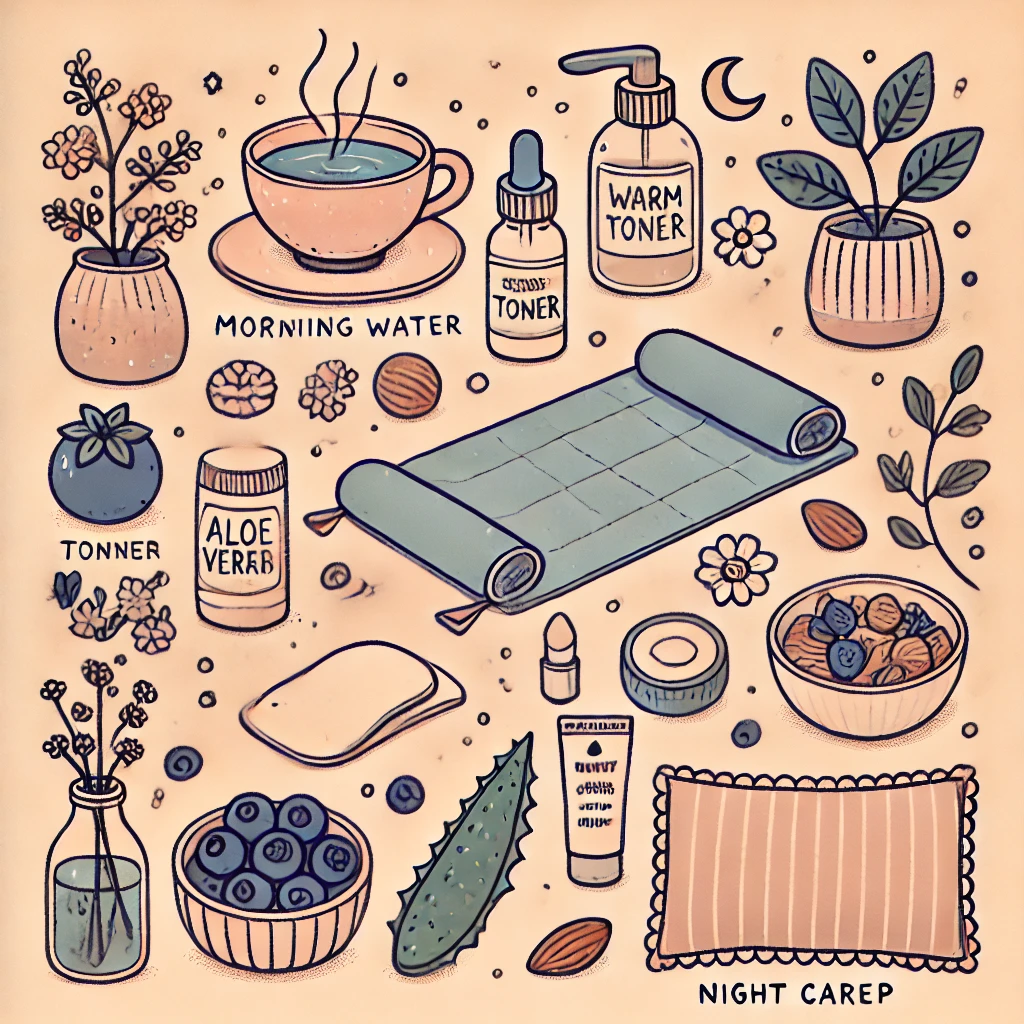 起床後は、温めたハーブティーを飲むことから始めます。カモミールやローズヒップなどのハーブには、抗酸化作用があり、体内からの美容ケアをサポートします。その後、軽いヨガやストレッチで血行を促進し、老廃物の排出を助けます。